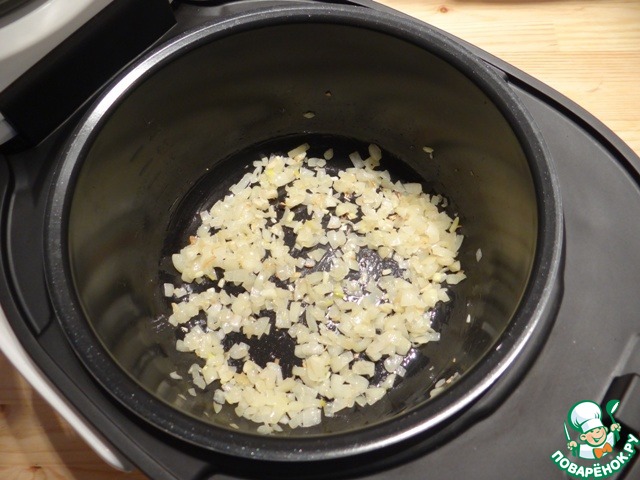 В чаше мультиварки на программе "Поджаривание" обжариваю репчатый лук, порезанный кубиками, на растительном масле.