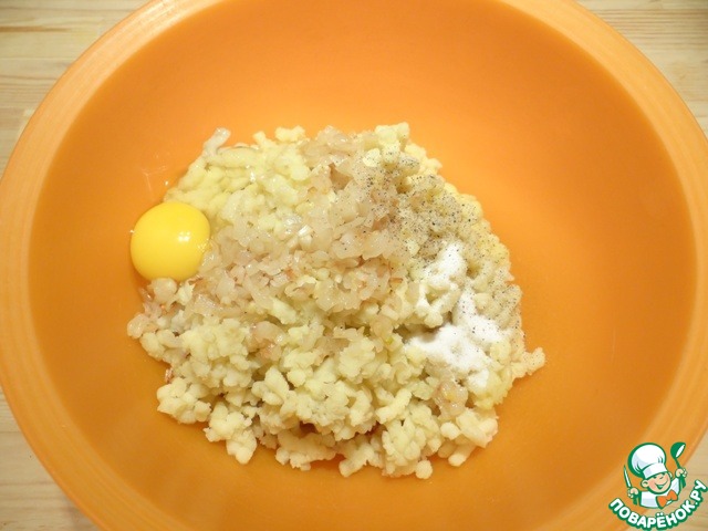 К прокрученному на мясорубке картофелю добавляю обжаренный лук, яйцо, соль, черный молотый перец.