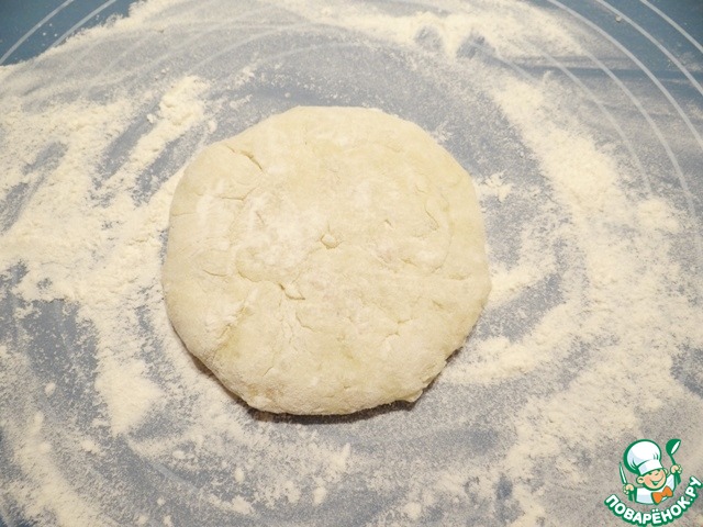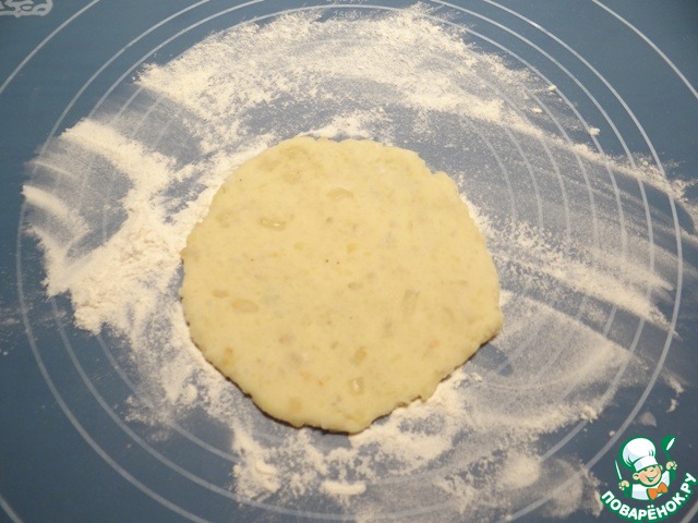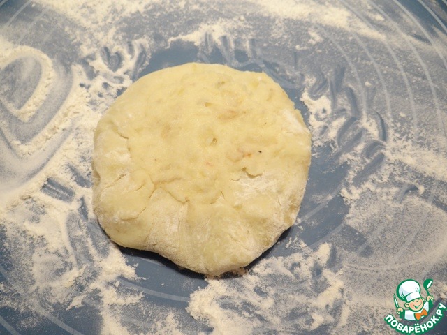 Отщипываю кусок картофельного теста и, используя муку для подпыла, формую тонкую лепешку.