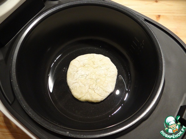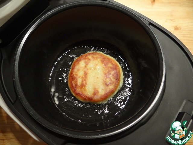 На программе "Поджаривание" нагреваю в чаше мультиварки растительное масло и обжариваю картофельную лепешку сначала с одной стороны,