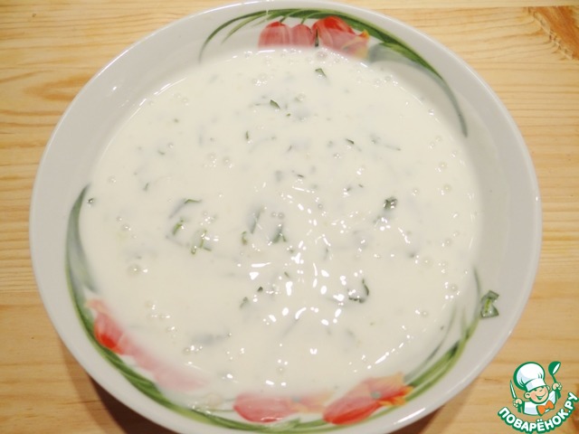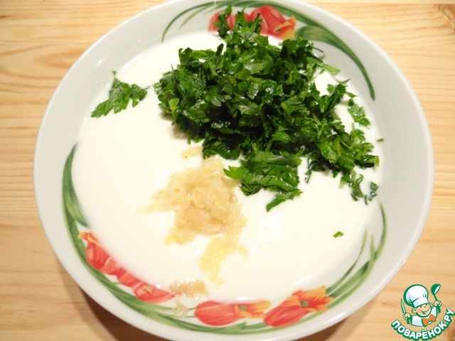 Готовлю соус. К йогурту добавляю соль, измельченный чеснок, мелко порезанную зелень петрушки, перемешиваю все ингредиенты.