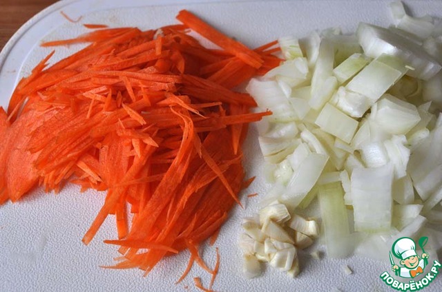 Овощи моем, чистим. Мелко нарезаем чеснок, кубиками лук. Морковь натираем на мелкой тёрке.