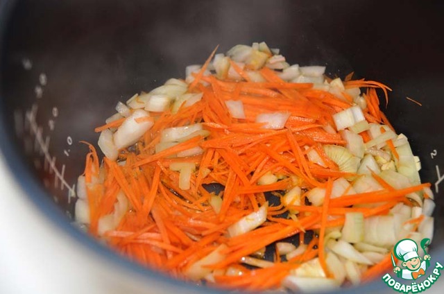 Включаем мультиварку на режим "Поджаривание", в чашу наливаем растительное масло.