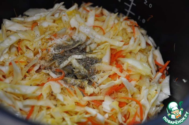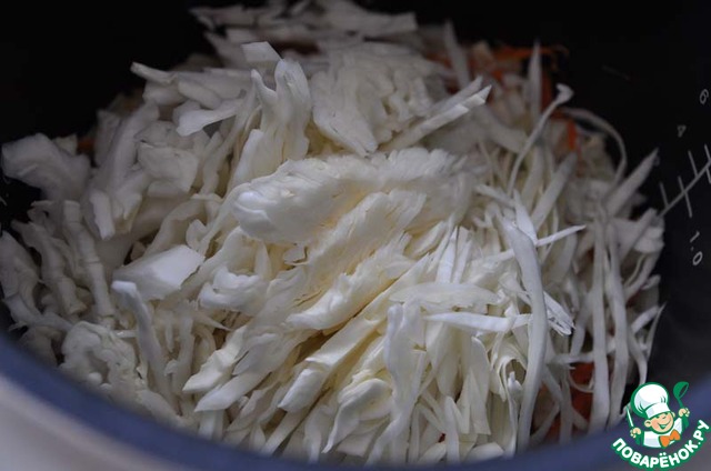 Добавляем нарезанную соломкой капусту и продолжаем помешивать. Капуста должна не обжариться, а как бы слегка подвариться.