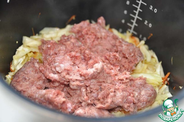 Кладём фарш, перемешиваем.