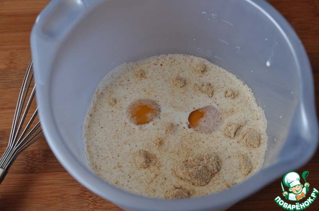 Берём сливки, панировочные сухари, соль и яйца, взбиваем венчиком.