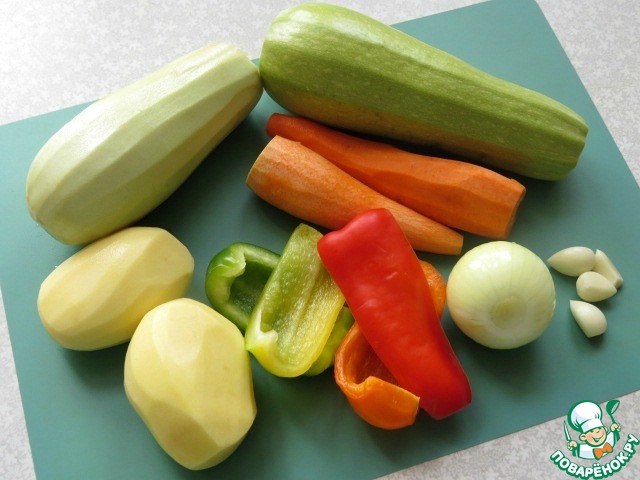 Баклажан, кабачок, картофель и морковь натираем на крупной тёрке. Болгарский перец и лук нарезаем тоненькой соломкой. Чеснок пропускаем через пресс.