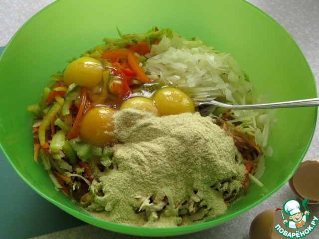 В овощную массу добавляем яйца, панировочные сухари, соль, перец и любимые приправы по вкусу. Хорошо всё смешиваем, если выступило много жидкости просто убираем её ст. ложкой.