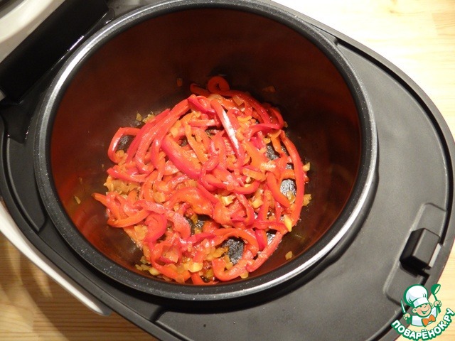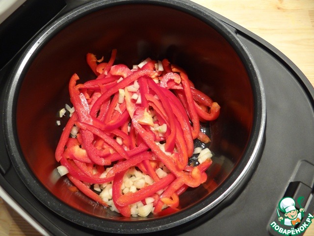 На программе "Поджаривание" обжариваю на растительном масле сладкий перец и лук.