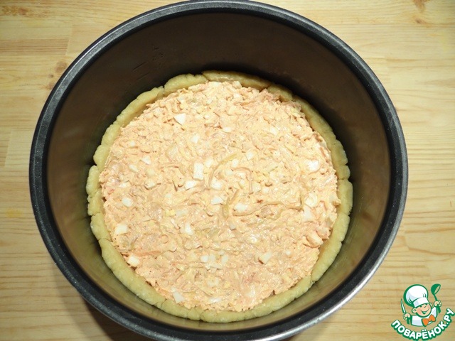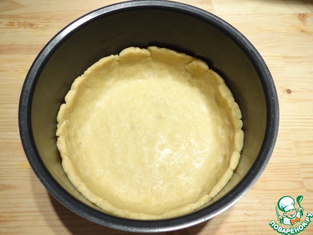 Чашу мультиварки смазываю растительным маслом. Тесто достаю из холодильника, раскатываю скалкой, выкладываю основу для пирога с бортами в чаше мультиварки.