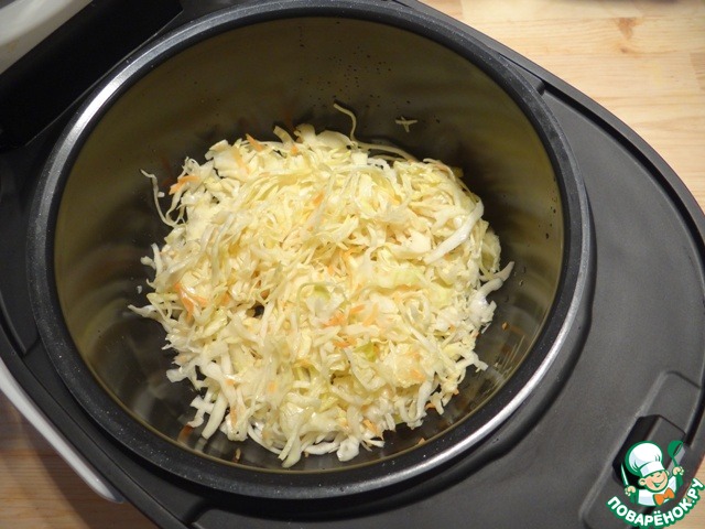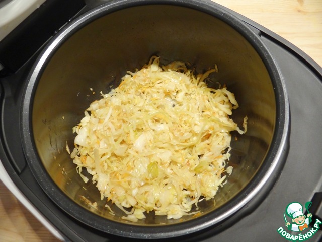 В это время готовлю начинку. Мультиварку включаю на программу "Поджаривание". В чашу мультиварки наливаю растительное масло и добавляю промытую и отжатую квашеную капусту.