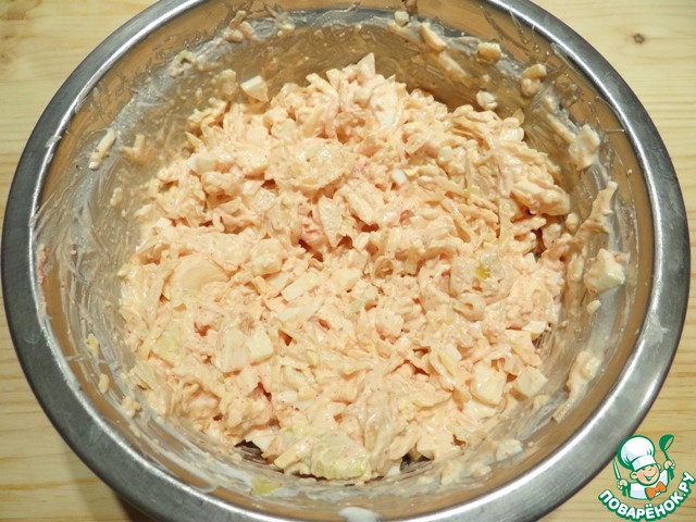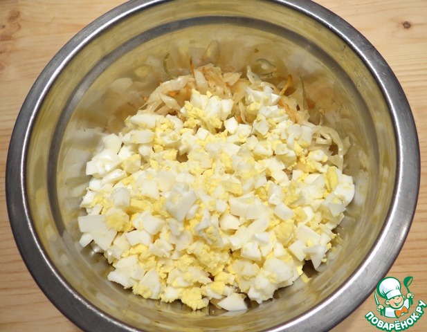 Вынимаю капусту в миску, даю ей остыть, добавляю вареные яйца, порезанные кубиками.