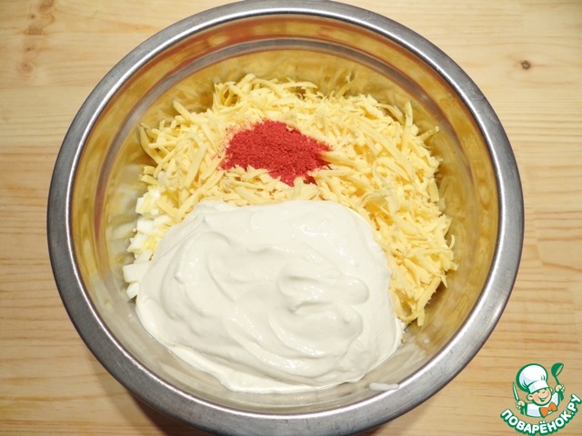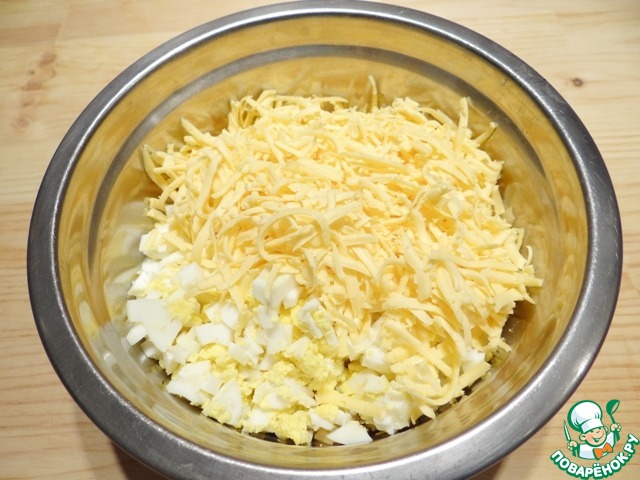 К капусте добавляю еще твердый сыр, натертый на крупной терке.