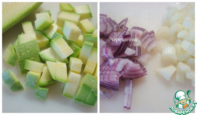 Кабачки порезать кубиками. Сельдерей и лук полукольцами.
