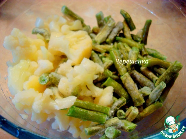 Приготовить цветную капусту и стручковую фасоль. Я не размораживала.
