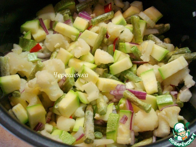В чашу мультиварки выложить кабачки, сельдерей, лук, чеснок, красный перчик, грибы, цветную капусту, фасоль и кардамон. Перемешать.