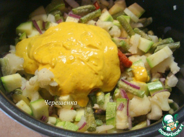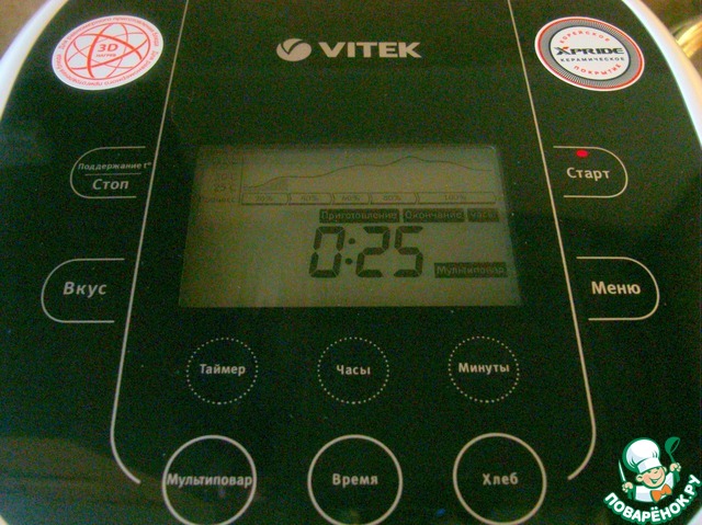 Выбрать режим мультиварки «Мультиповар» на 100 градусов, время приготовления 25 минут. Режим «Мультиповар» можно заменить режимом «Тушение».