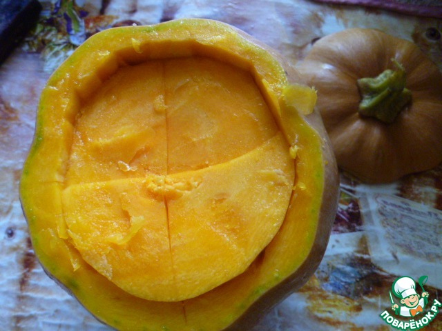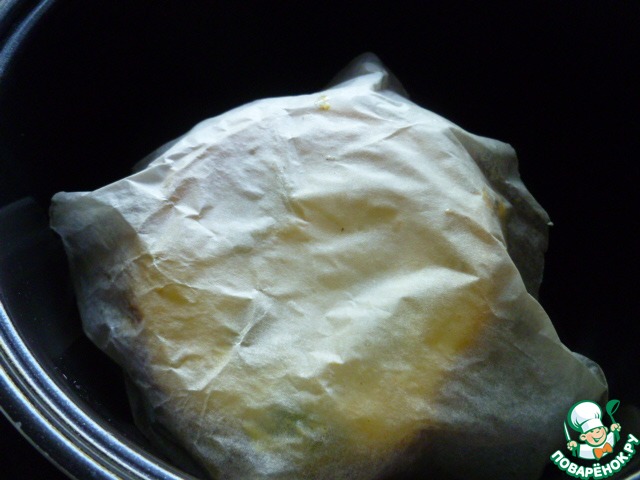 Крышечка у меня не поместилась, иначе крышка мультиварки не закрывалась. Тогда я взяла пергамент и накрыла им сверху тыкву.