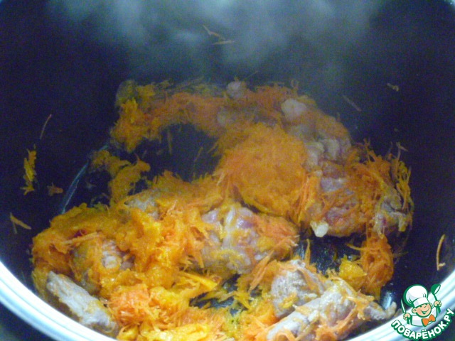 Затем добавить тыкву и морковь, обжарить до мягкости.
