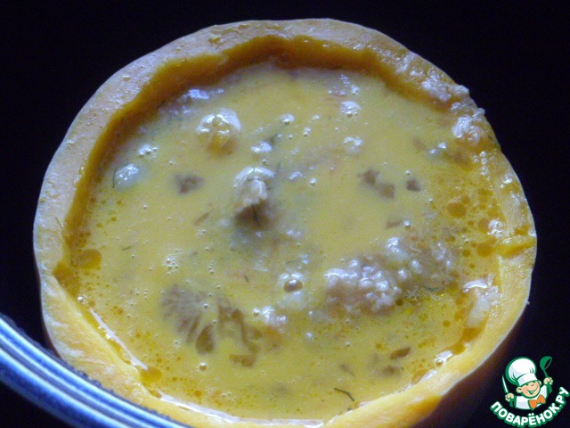 На дно чаши наливаем 0.5 стакана воды, ставим тыкву, фаршируем ее тушеной картошкой, добавляем укроп.
