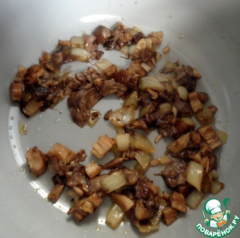 Мелко порезать лук и грибы, посолить и поперчить по вкусу. Включить мультиварку в режиме "жарка" и обжарить их на растительном масле, периодически помешивая.