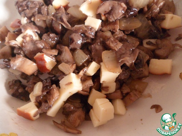 Соединить грибную поджарку с порезанным кубиками копченым сыром.