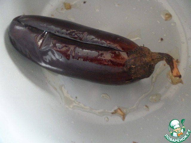 Баклажан вымыть, сделать продольный надрез, смазать растительным маслом и посыпать солью. Включить мультиварку в режиме "Запекание" на 40 минут. Положить баклажан в чашу и готовить при закрытой крышке.