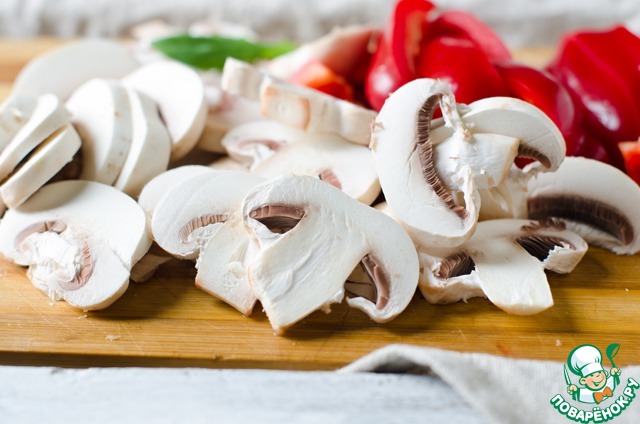 Шампиньоны нарезать ломтиками, а болгарский перец полосками.