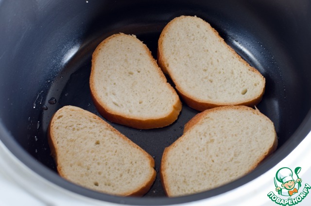 Затем чистую чашу мультиварки смазать немного растительным маслом, уложить в нее тонко нарезанные ломтики батона, выбрать программу Жарить и установить время 15 минут.