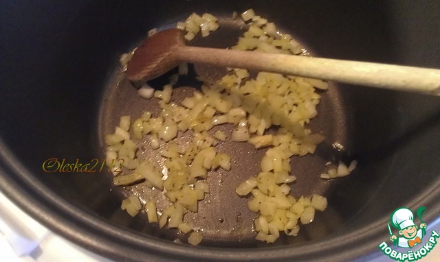 Лук мелко режем. Включаем мультиварку в режим "Жарка" время 10 минут. На дно чаши наливаем растительное масло и выкладываем лук. Пассеруем его 2-3 минуты.