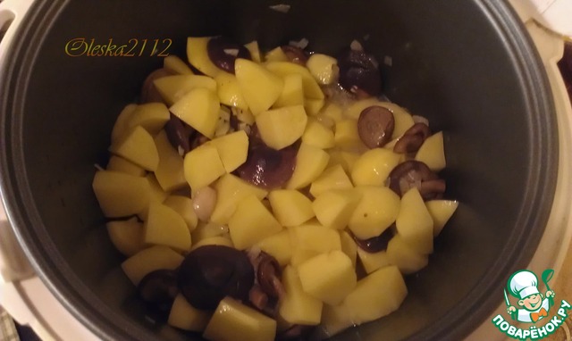 Картофель режем не мелкими кубиками, выкладываем в чашу мультиварки к луку и грибам. Добавляем горячей воды до уровня на 1,5 пальца ниже уровня картофеля.