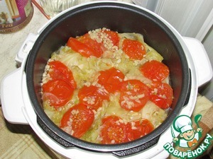 4. Молодую капусту (небольшую), режем на квадратики, по размеру похожие на порезанный перец, выкладываем поверх перца, солим, не мешаем.