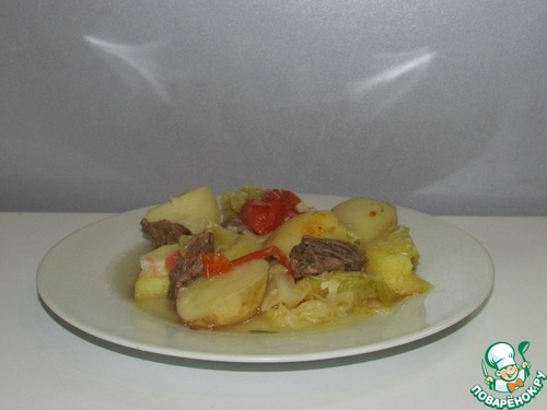 Этот блюдо можно готовить и в обычной кастрюле, а лучше в гусятнице. Принцип тот же, единственное отличие - вы кладете мясо с маслом в кастрюлю и сразу ставите на медленный огонь, и оно тушится, пока вы чистите картофель. Потом выкладываете картофель и, не выключая плиты, начинаете резать перец, а затем капусту и помидоры. Потом закрываете и на 38 минут оставляете, Ничего не мешая. Через 38 минут добавляете чеснок и готовите еще 2 минуты.
