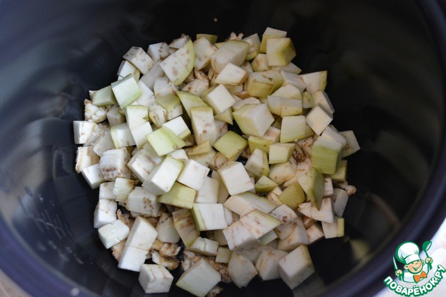 Приступаем к начинке. Режем кубиками мякоть и отложенные верхние части баклажан. Чашу мультиварки смазываем растительным маслом. Выкладываем туда наши нарезанные баклажаны.