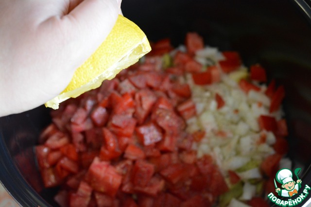 Солим, перчим (по вкусу). Этими овощами буду фаршировать баклажаны, а чтобы они при готовке сохранили максимально привлекательный вид, сбрызгиваю их соком лимона.