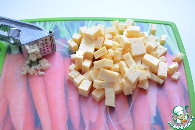 По наши овощи пекутся, выдавим чеснок через пресс и нарежем небольшими кубиками сыр.