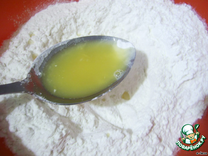 В миску просеять муку + соль, добавить 2 ст. л. сока, у меня свежевыжатый, выдавить из 1/4 апельсина (можно из мандарина).