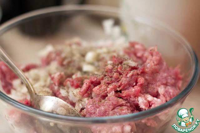 Готовим начинку. Мясо пропустить через крупную решетку мясорубки. Добавить измельченный лук, черный молотый перец, соль, холодную воду. Тщательно перемешать.