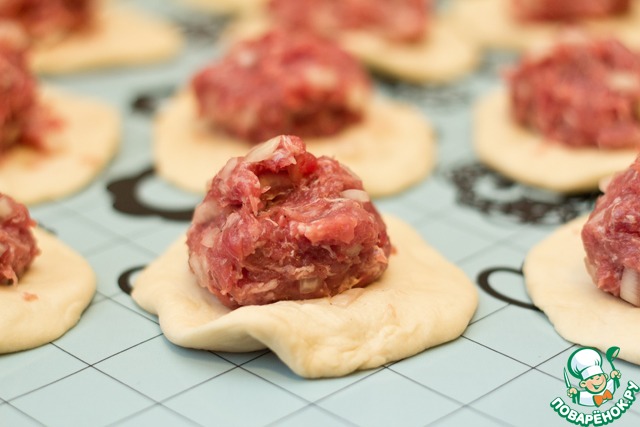 Каждый шарик расплющить в лепешку. На середину каждой лепешки выложить по 45 г начинки (по рецептуре предлагается 48 г).