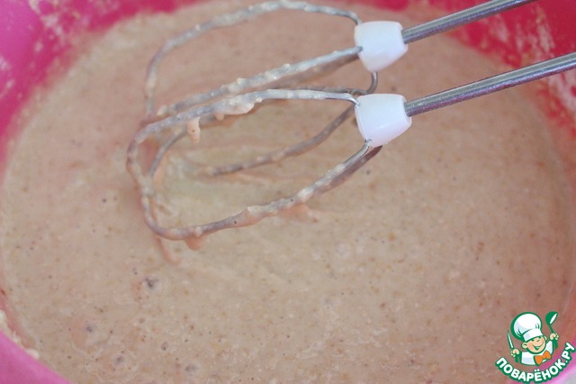 Непрерывно взбивая, добавлять постепенно овсяную муку и отруби.