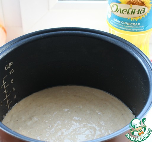 В самом конце добавить подсолнечное масло, мед, соду (не гасить!) и корицу, тщательно перемешать. Тесто получится достаточно густым. Перелить тесто в смазанную растительным маслом чашу.