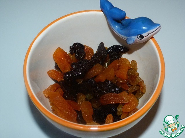 Сухофрукты - изюм, курага, чернослив или можно еще какие по вкусу, но в общей массе их должно быть 150 г - залить 2-мя ст. ложками апельсинового ликера.