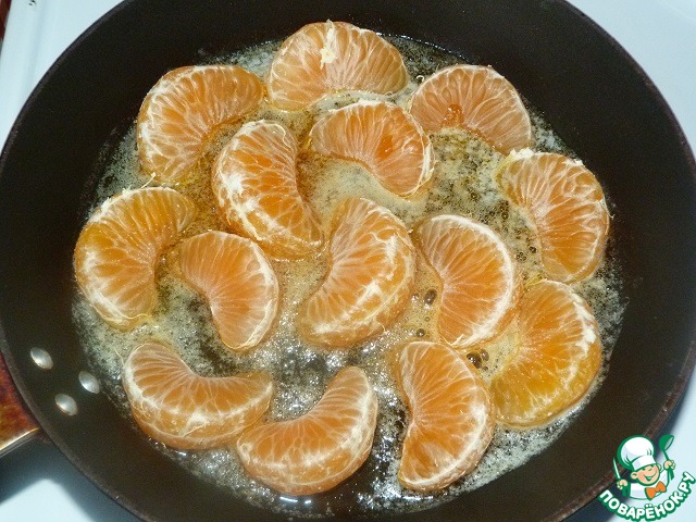 Спустя час, разогреть сковороду с 20 г сливочного масла, высыпать 1 ч. ложку сахара и обжарить мандарины - примерно по 2-3 минуты с каждой стороны