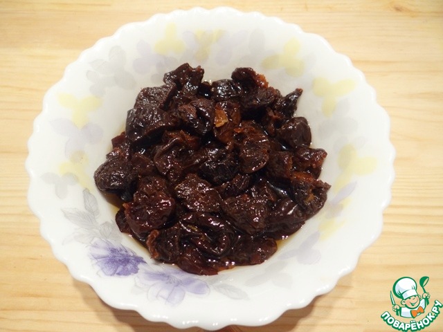 Сначала мою чернослив, обсушиваю его с помощью бумажного полотенца, разрезаю пополам, заливаю коньяком примерно на 30 минут. Затем коньяк сливаю, чернослив опять чуть обсушиваю с помощью полотенца.
