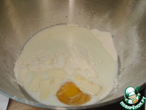 Я замешивала тесто с помощью миксера. Для теста: нагреть молоко, Просеять муку, добавить сахар 2 ст. ложки, соль, дрожжи, молоко и добавить яйцо, сливочное масло. Вымесить гладкое тесто.