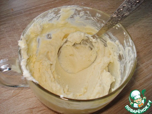 Для творожной начинки смешать творог с желтком, сахаром 2 ст. ложками и крахмалом.