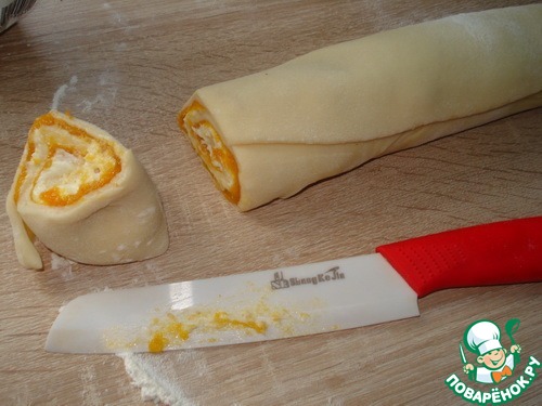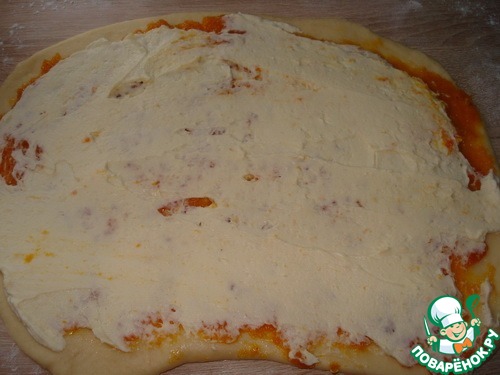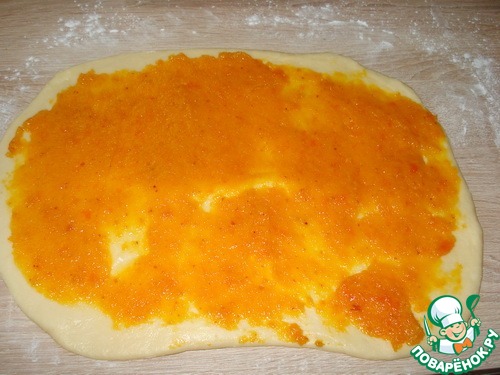Подошедшее тесто раскатываем в прямоугольник, смазываем начинкой из кураги.