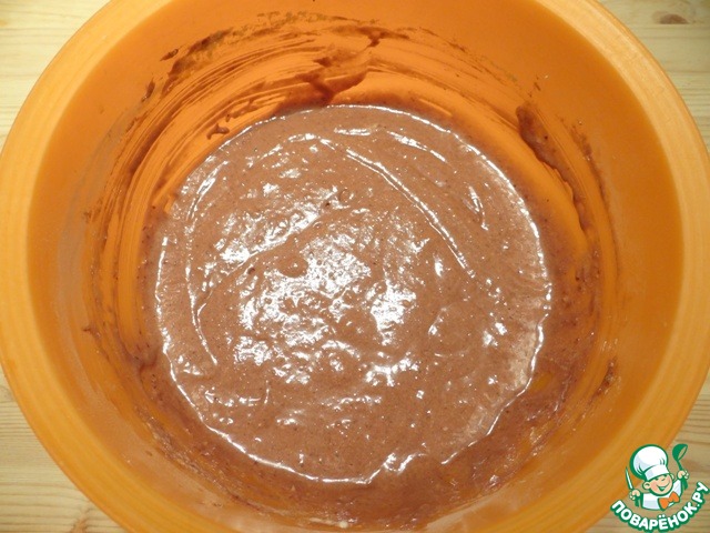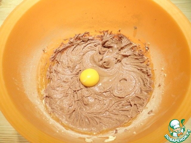 К масляной массе добавляю муку с какао и разрыхлителем. молотый фундук, молоко. Массу хорошо перемешиваю.