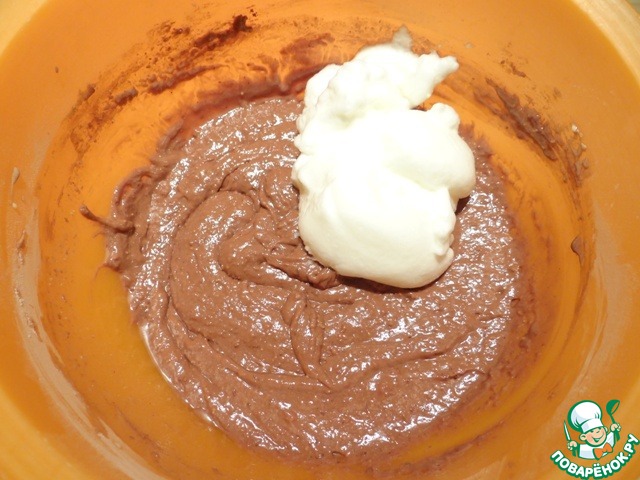 Белки хорошо взбиваю миксером. Добавляю треть взбитых белков к шоколадной массе, аккуратно перемешиваю ложкой движениями сверху вниз.