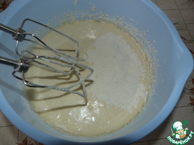 Продолжая помешивать, добавить к этой массе набухшую манку с кефиром. И добавить соду (гасить не надо).